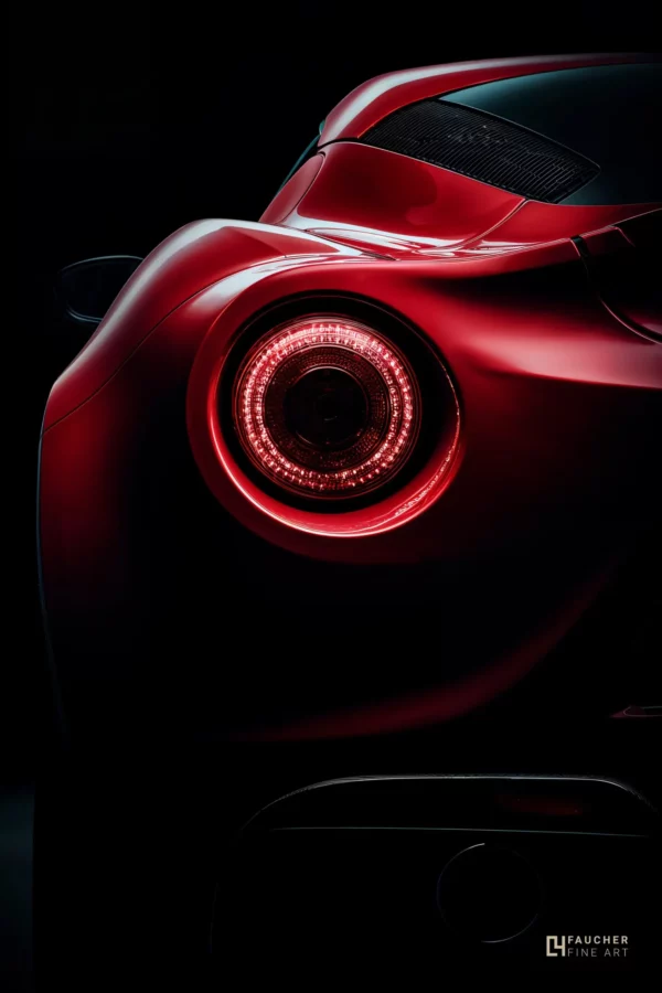 Photographie fine art automobile représentant un gros plan de l’arrière d’une voiture de collection rouge, mettant en valeur le feu circulaire et les courbes sculpturales de la carrosserie.