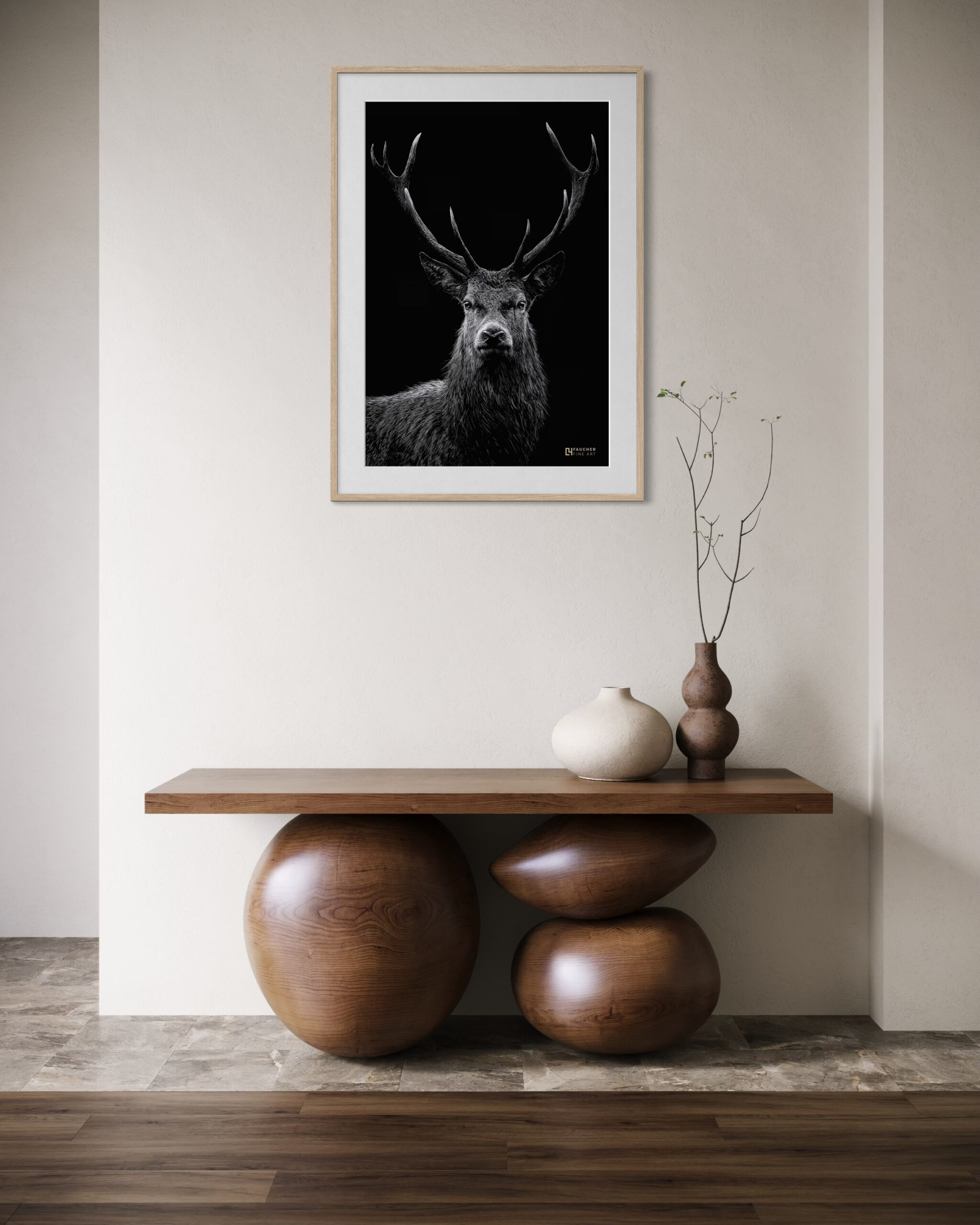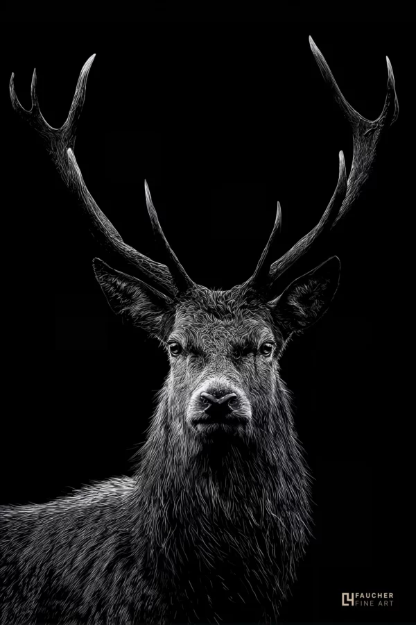 Le contraste marqué et le travail de la lumière mettent en valeur la texture du pelage et la puissance des bois, renforçant l’impression de force, de calme et de dignité animale.